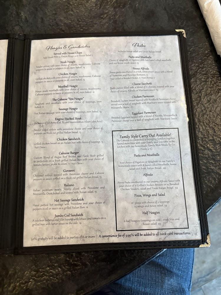 Popular menu items include the Giovanni sandwich, featuring hot peppers and homemade chips. The house salad, with crisp ingredients, complements many dishes well. Desserts are also noteworthy, offering delightful sweet treats to finish off the meal. Whatever the craving, The Caboose has a delicious option ready to serve.